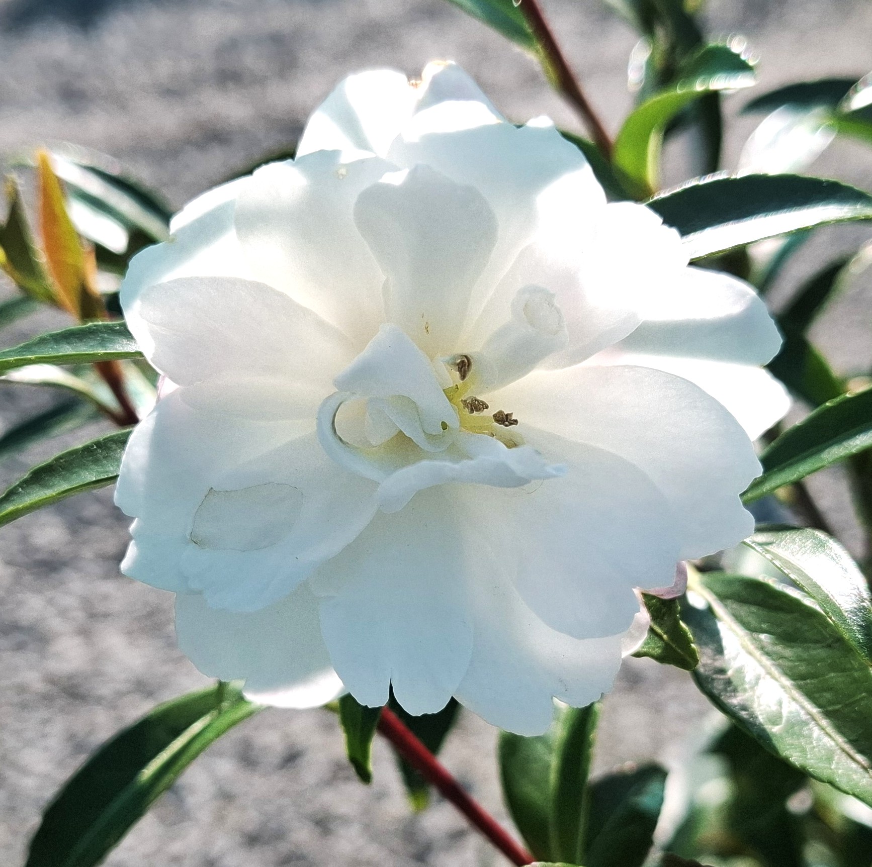Abundant petite, white peony-like flowers in autumn on a small leaved, compact dwarf camellia. One of the earliest-flowering camellias. Prefers a sheltered site in semi-shade. A hardy evergreen. Sasanqua. 1.2m.