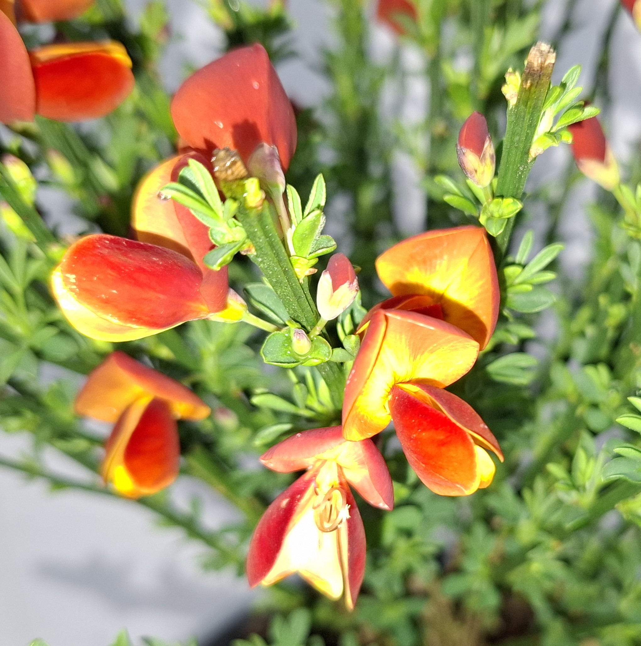 Almost leafless upright shrub with slightly weeping branches, clothed with masses of lemon yellow pea flowers with ruby wings. 1m