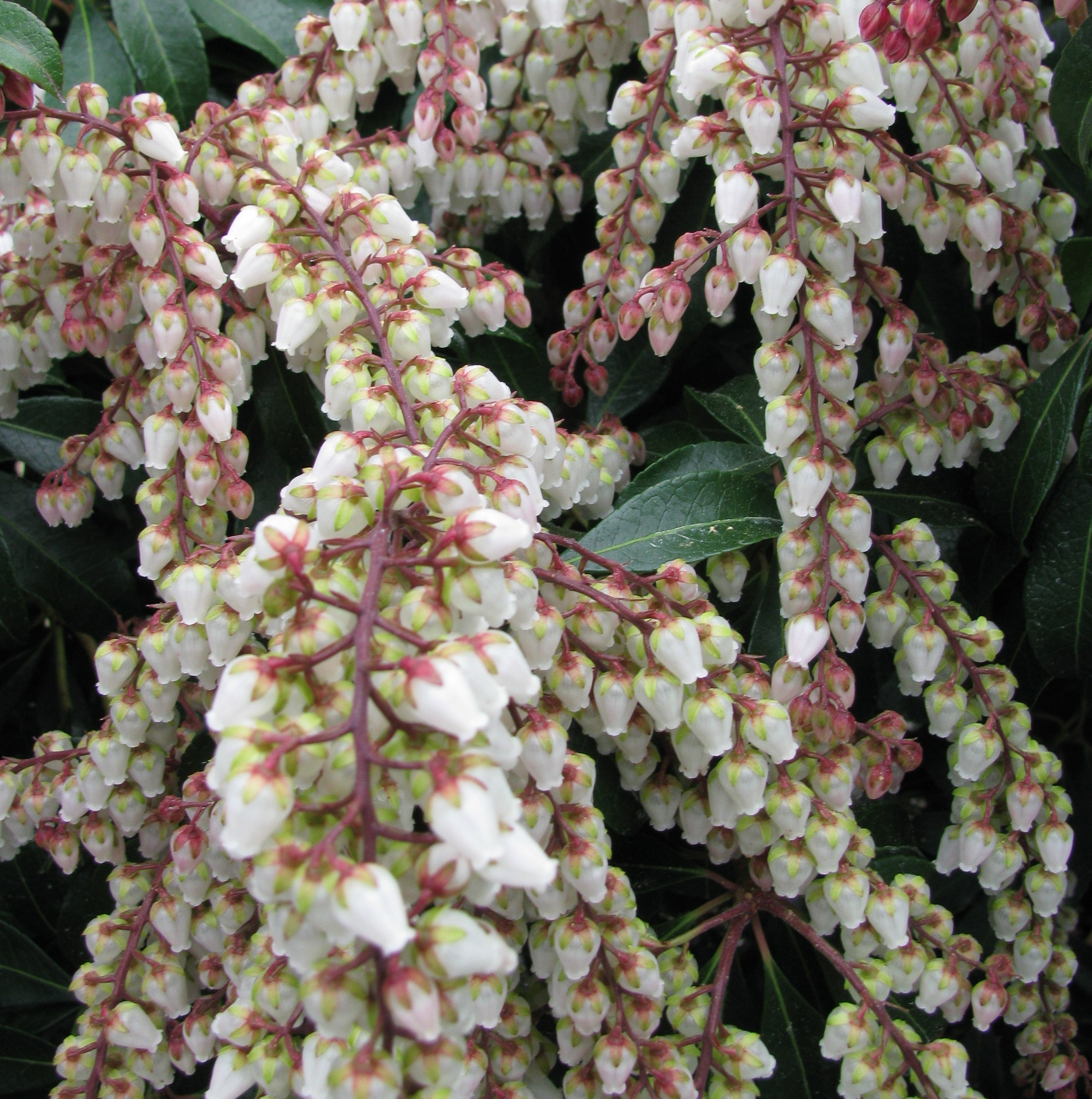 Dense sprays of pendulous dark red buds opening to pale pink. Colourful red foliage. 1.5m